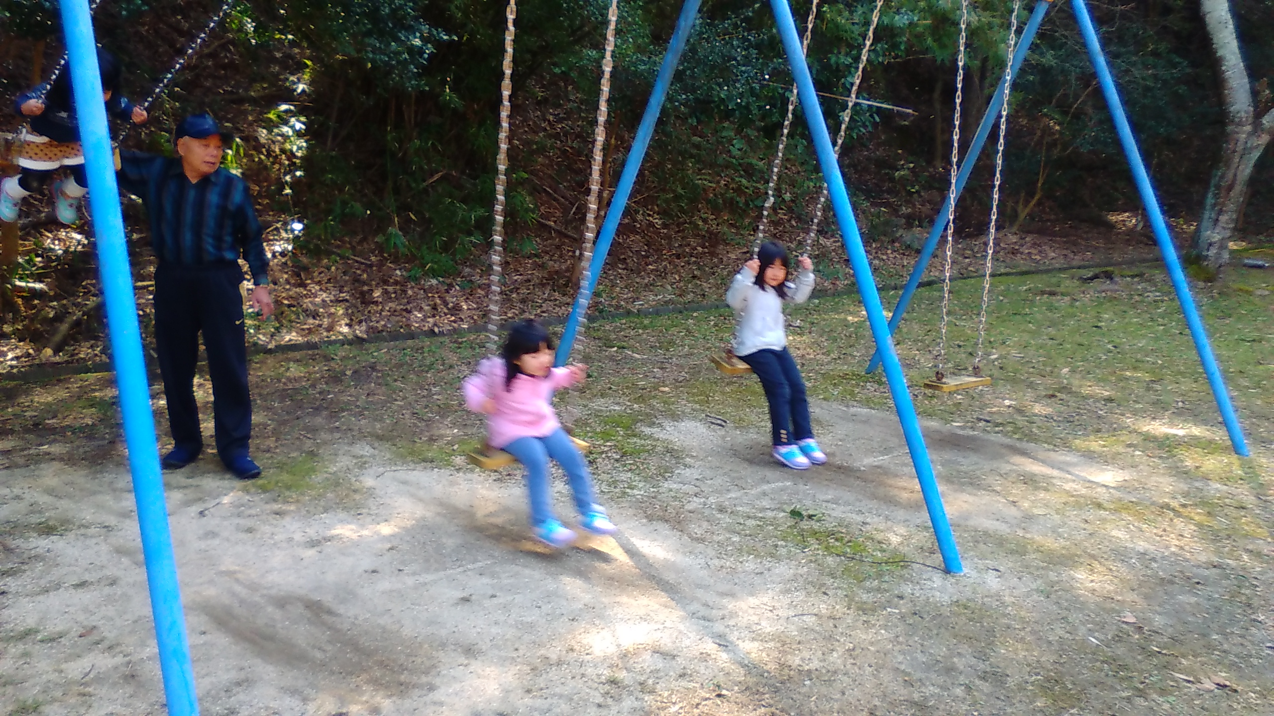 長男と友達は自分たちで遊んでいたので、僕は下の子達のブランコを押していると、おじいちゃんと来た3人もブランコで遊び始めました。